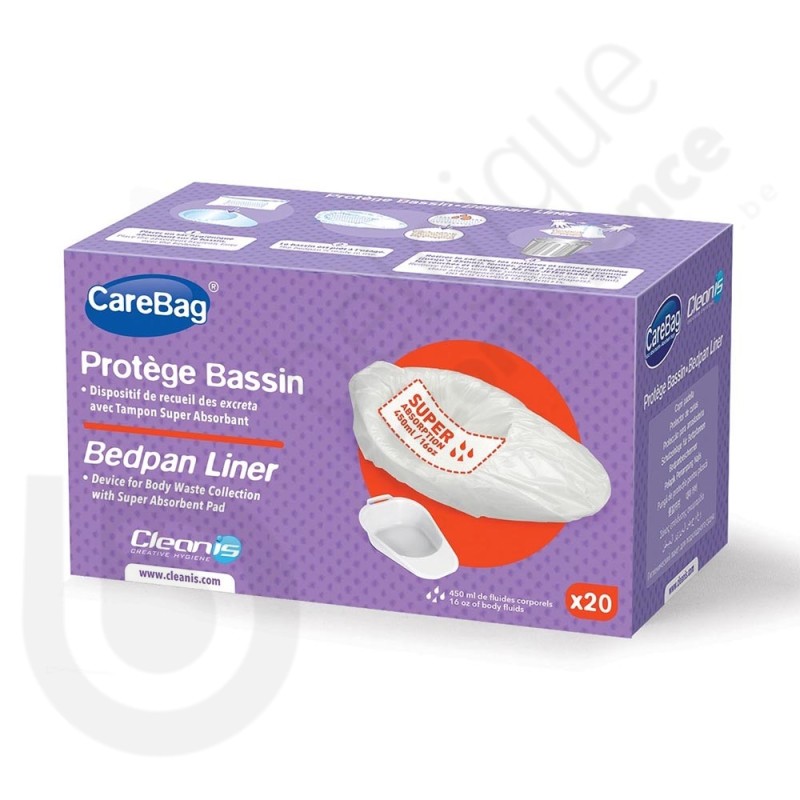 CareBag Protège Bassin est un dispositif de recueil des excreta à liens coulissants au format adapté au bassin de lit, muni d'un tampon super-absorbant.