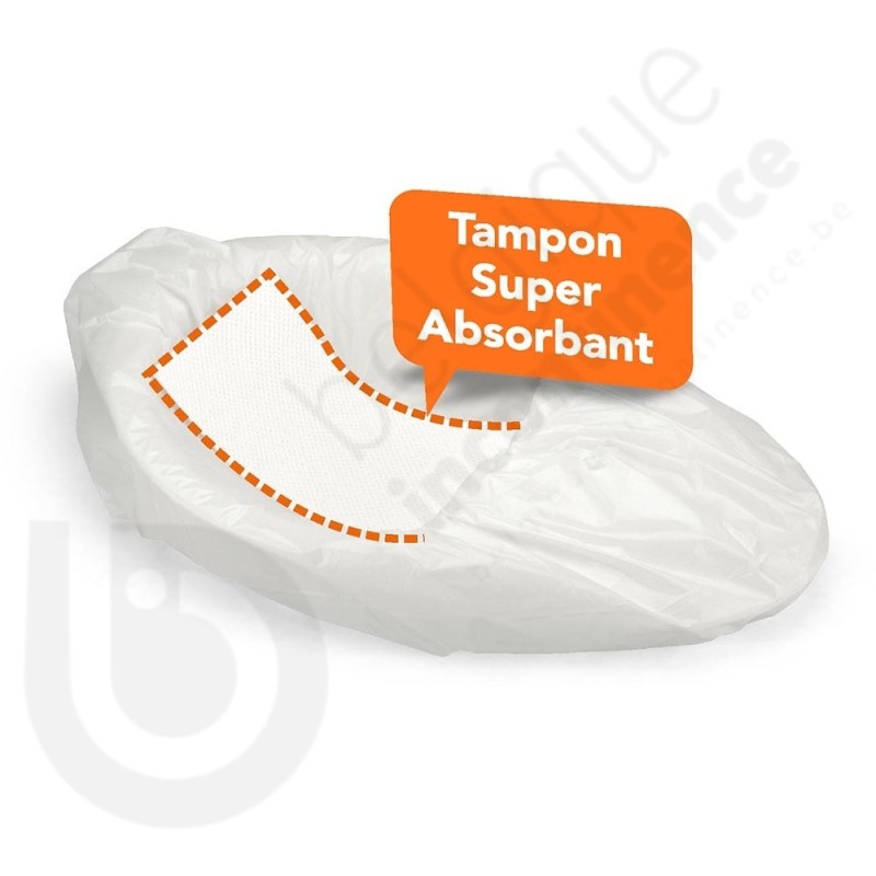 Au contact des fluides et des matières, le tampon agit dès le premier contact avec les liquides pour gélifier le contenu, et ainsi limiter, après fermeture, le risque de renversement et d'éclaboussures tout en emprisonnant les odeurs. Il protège également le bassin de lit, évitant ainsi sa souillure et les contaminations liées à sa manipulation.