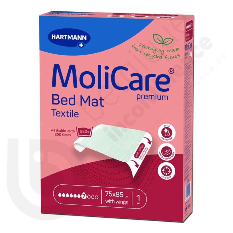 La protection Molicare Bed Mat Textile 7 Gouttes 75 x 185 cm (avec rabats) est une alèse lavable de la marque Hartmann qui est utilisée pour protéger les lits, les divans et les chaises.