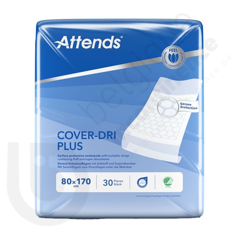 La protection Attends Cover-Dri Plus 80 x 170 cm est une alèse bordable jetable de la marque Attends qui est utilisée pour protéger des surfaces en cas d'incontinence urinaire modérée.