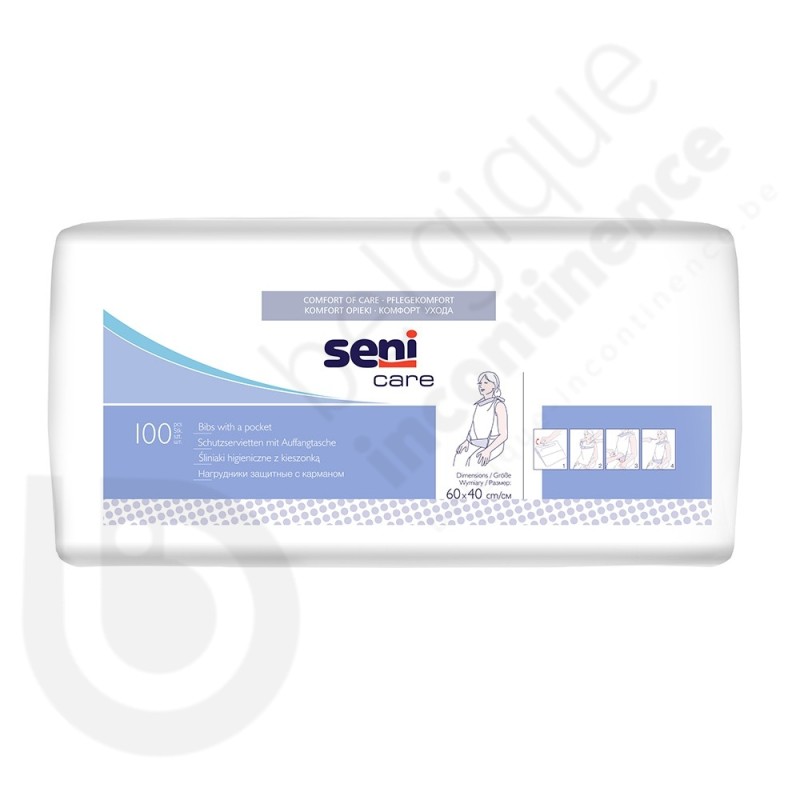 Les bavoirs adultes jetables Seni Care. Plastifiés, avec poche de recueil, attachés à l'arrière, ils sont recommandés pour une protection hygiénique lors des repas. Particulièrement adaptés aux soins des personnes dépendantes.