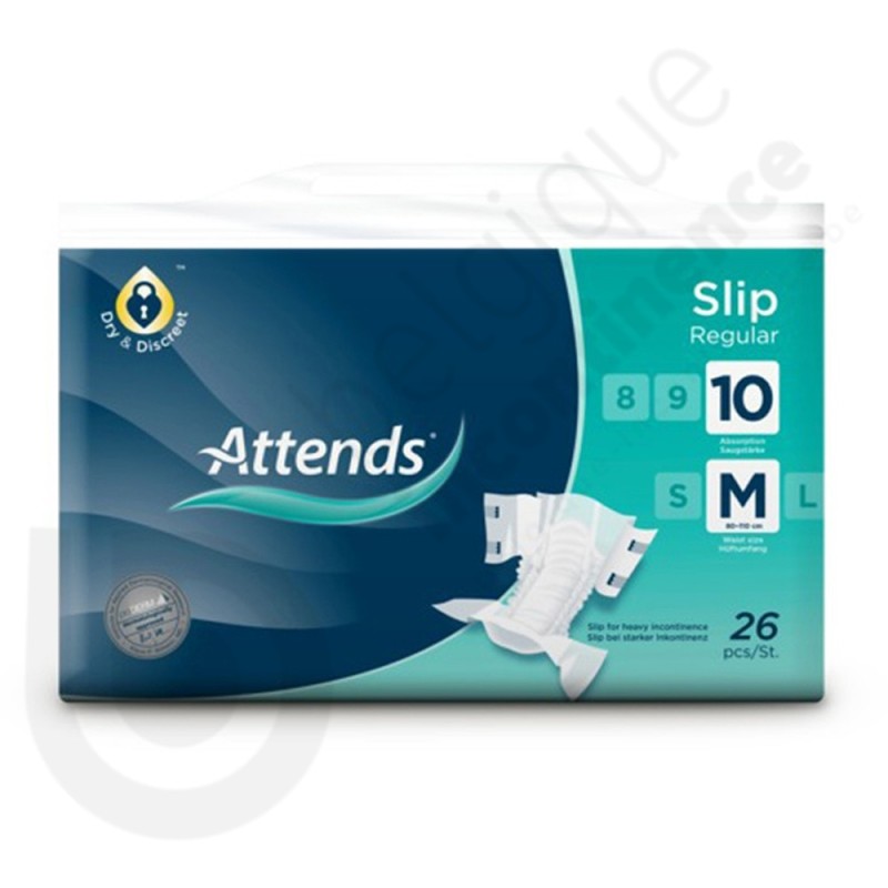 La protection Attends Slip Regular 10 est un change complet en non-tissé de la marque Attends qui convient en cas d'incontinence urinaire ou fécale sévère.