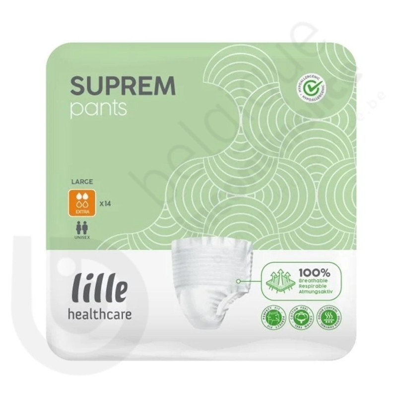 La protection Lille Suprem Pants Extra est un change mobile en non-tissé de la marque Lille qui convient en cas d'incontinence urinaire ou fécale modérée.