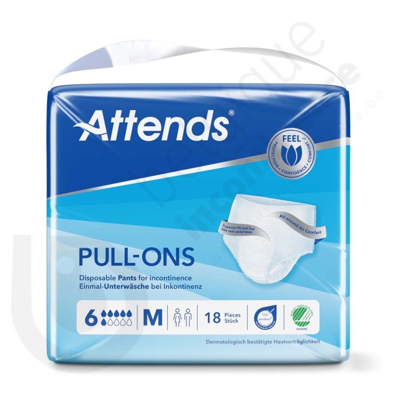 La protection Attends Pull-Ons 6 est un change mobile en non-tissé de la marque Attends qui convient en cas d'incontinence urinaire ou fécale moyenne.