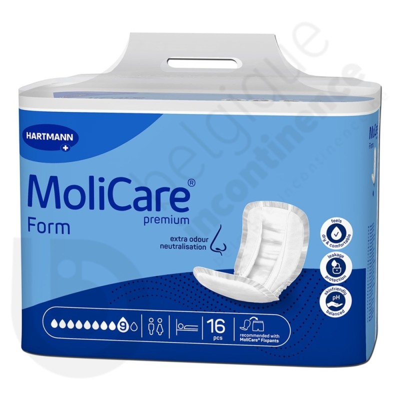 La protection Molicare Form 9 Gouttes est une couche anatomique en non-tissé de la marque Hartmann qui convient en cas d'incontinence urinaire ou fécale grave.