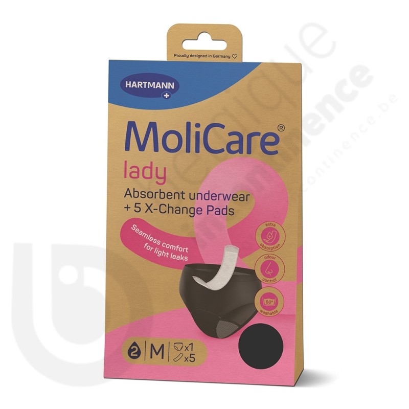 Molicare Lady Lavable Sous-Vêtement Absorbant 2 Gouttes + 5 Protections est un sous-vêtement absorbant et lavable qui s'utilise avec les protections anatomiques de la marque Hartmann.