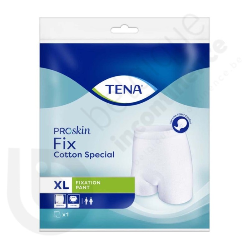 De zachte, comfortabele, ondergoedachtige TENA Fix Cotton Special houdt anatomisch gevormd incontinentiemateriaal, zoals TENA Comfort, goed op zijn plaats. Het heeft een brede elastische taille en pijp met extra elastiek in het kruis. Dankzij een speciale mix van 71% katoen, 25% polyester en 4% elastaan biedt TENA Fix Cotton Special een onberispelijke pasvorm door zich perfect aan te passen aan de vorm van het lichaam, wat een gezonde huid bevordert. Kies voor optimaal comfort en pasvorm de juiste maat uit een breed assortiment en krijg de beste ondersteuning. TENA Fix Cotton Special kan tot 50 keer worden gewassen op 60 graden en in de droger op een zacht programma zonder vormverlies.