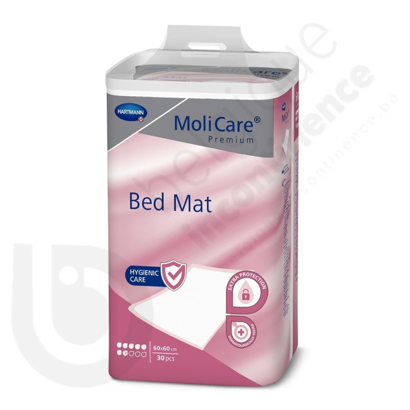 Molicare Bed Mat 7 Druppels 60 x 60 cm is een wegwerponderlegger uit vliesstof van het merk Hartmann die gebruikt wordt om bedden, divans en zetels te beschermen.