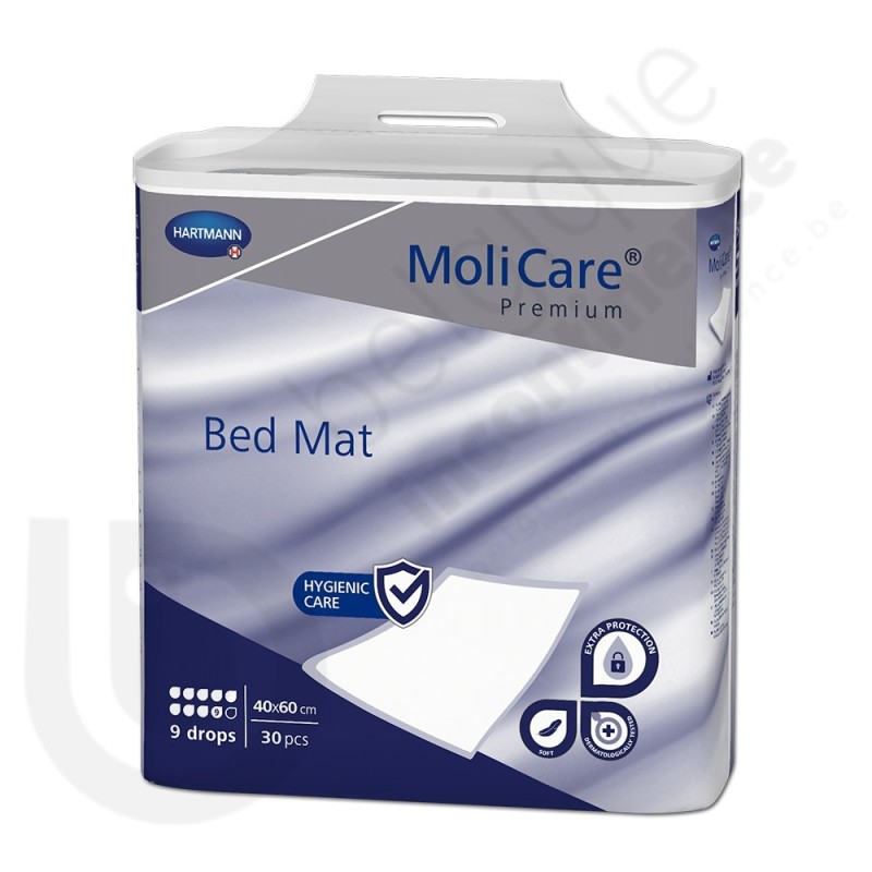 Molicare Bed Mat 9 Gouttes 40 x 60 cm is een wegwerponderlegger uit vliesstof van het merk Hartmann die gebruikt wordt om bedden, divans en zetels te beschermen.