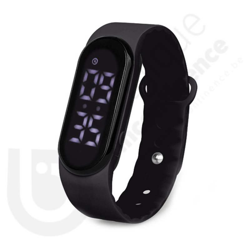 Het Buddy-trilhorloge beschikt over een digitaal ledscherm dat bestand is tegen spatten en een soepel armbandje. Het kan met een micro-usb-kabel worden opgeladen.